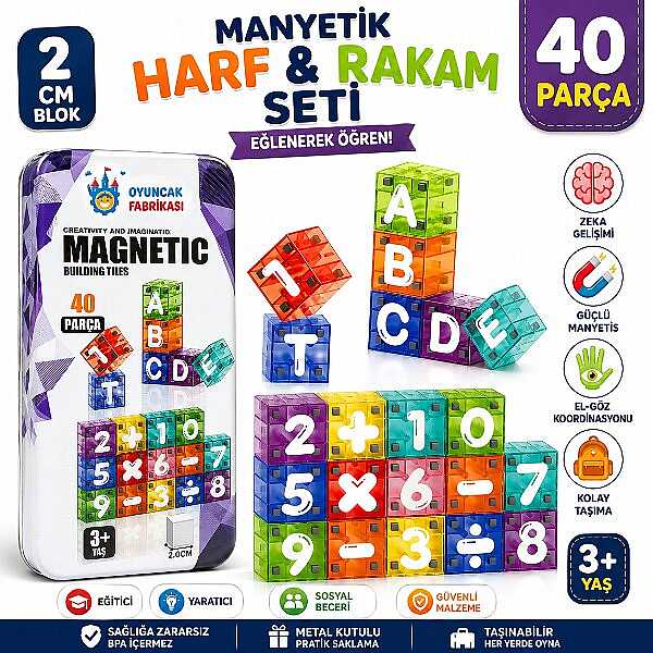 Çocukların hem eğlenerek öğrenmesini sağlayan 40 Parça Manyetik Harf ve Rakam Seti, okul öncesi gelişim için özel olarak tasarlanmıştır. Güçlü mıknatıslı yapısı sayesinde bloklar kolayca birleşir ve çocuklar kendi kelimelerini, sayıları ve şekilleri oluşturabilir.