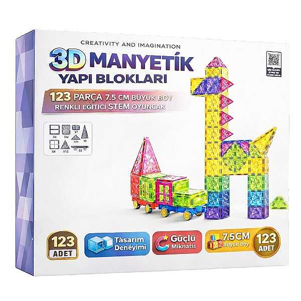Büyük Manyetik Yapı Blokları 123 Parça 7,5 Cm 3D Renkli Eğitici STEM Oyuncak ile çocuklar hayal gücünü sınırsız tasarımlara dönüştürür. Güçlü mıknatıs sistemi sayesinde parçalar kolayca birleşir; 3 boyutlu (3D) yapılar oluştururken hem eğlenir hem de öğrenir. 7,5 cm büyük boy parçalar, rahat kullanım ve güvenli oyun deneyimi sunar.